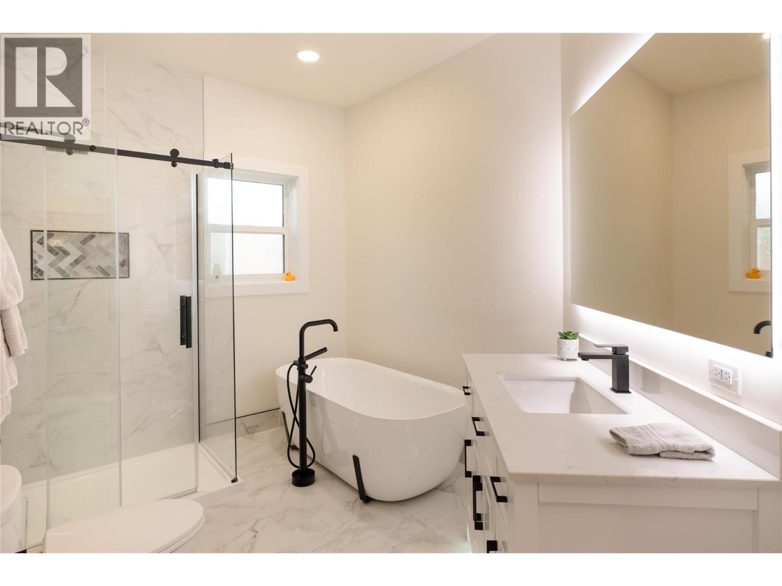 Looking for real space? A residence of this scale & flexibility is a rare find. With over 5,200 sq.ft., this home offers three bedrooms on the main level plus a fully self-contained one-bed in-law suite—also on the main level; with its own entrance & single garage. Ideal for multigenerational living or long-term guests. Set on a quiet cul-de-sac, the home welcomes you with a timeless exterior, level driveway & beautiful landscaping. Inside, the main floor is bright & inviting, offering vaulted ceilings, a wall of windows & warm stone fireplace anchoring the open-concept living & dining areas. The kitchen features rich wood cabinetry, granite counters & slate accents. Walk-out to a covered outdoor living space with room to lounge, dine & enjoy the surrounding greenery. The primary suite includes private deck access, a spacious walk-in closet & generous ensuite with a soaker tub & tiled shower. Two additional bedrooms complete the main level. Downstairs, the possibilities are endless—an expansive rec room, dedicated theatre zone, wet bar, fitness rooms & three more bedrooms create outstanding flexibility for families of all sizes. Storage is abundant. The main residence features a double garage, while the in-law suite enjoys its own single garage—three enclosed bays in total—plus plenty of on-site parking. The pool-sized yard offers room to grow, play or create your dream outdoor space. Minutes to schools, parks, shops & wineries, this is a rare opportunity to secure a large, versatile home in a quiet, family-friendly location. (id:6769)