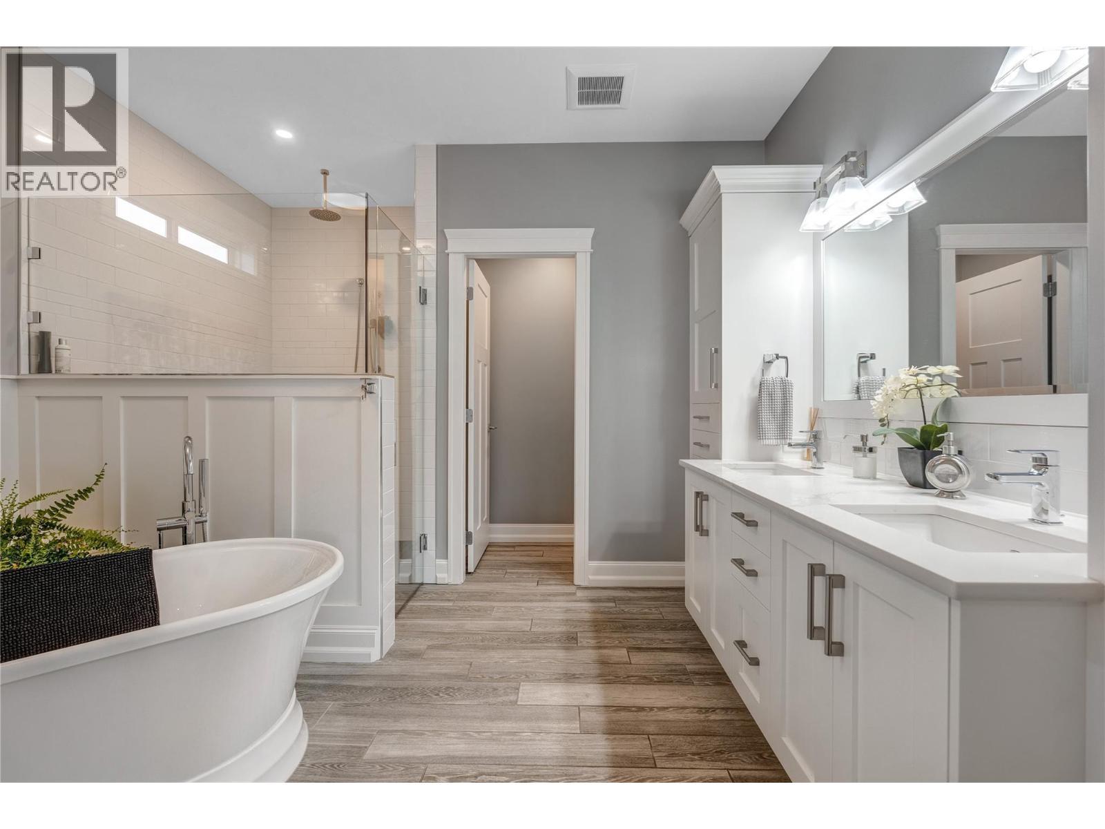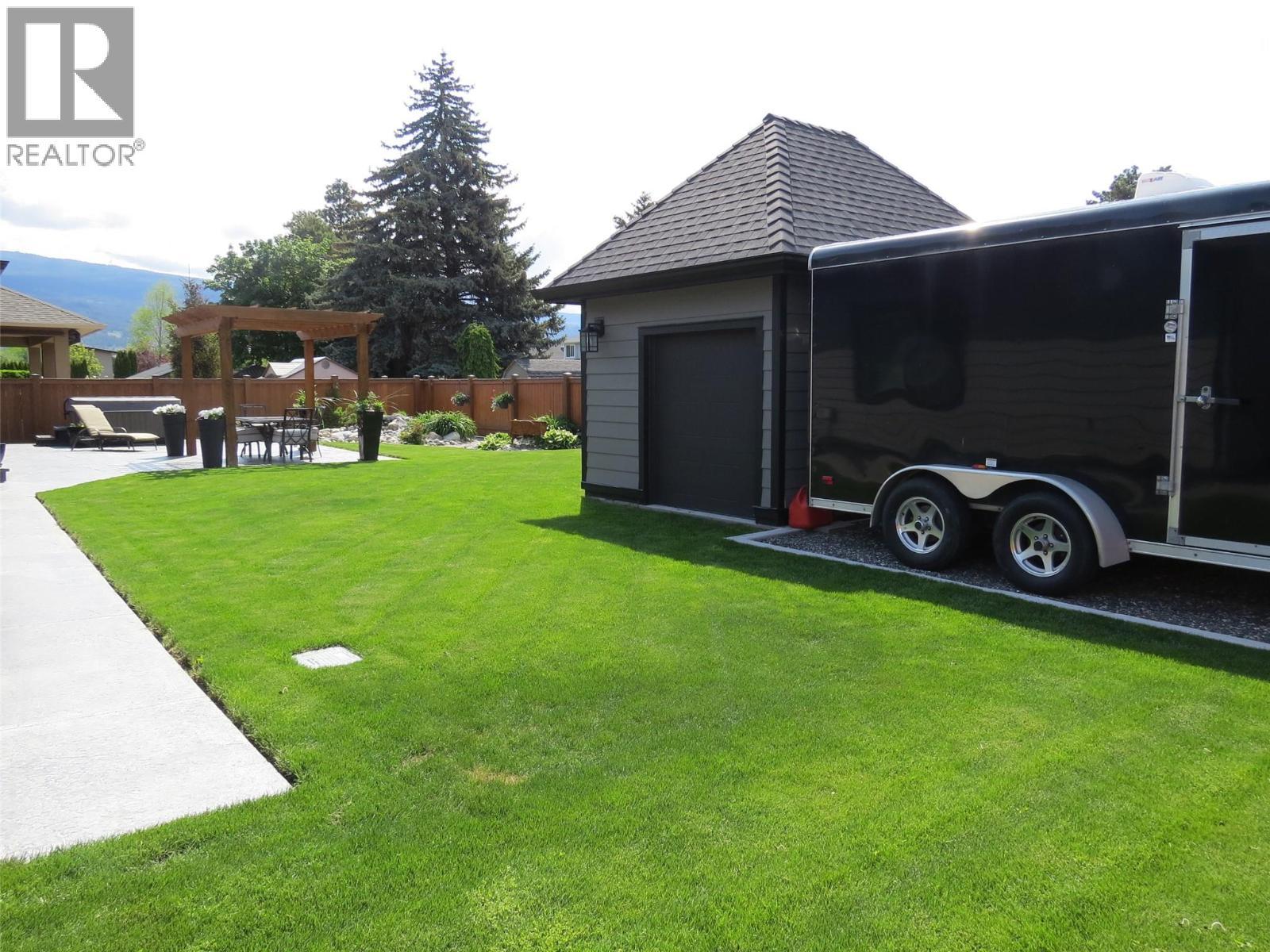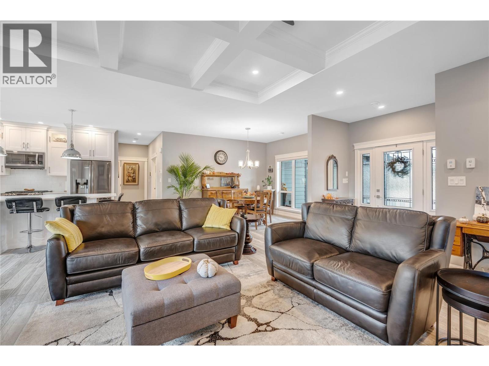 Exceptional custom-built luxury just steps from Okanagan Lake. This impeccably designed, 8-year-young level-entry rancher offers over 2,300 sq ft of refined living with 3 bedrooms, 3 bathrooms, and a versatile loft/bonus room. The open-concept layout showcases porcelain flooring throughout, soaring ceilings with elegant waffle detailing in the living room and primary suite, and a stunning kitchen ideal for both entertaining and everyday living. Comfort is elevated with natural gas in-floor heating (in concrete), plus central air conditioning and an efficient heat pump. A true standout is the oversized 28' x 26' heated garage with high ceilings, workshop space, janitor/dog wash area and access to a 6' basement providing extensive heated, dry storage and added versatility. Exterior finishes impress with natural stone accents, cement siding, and stamped concrete driveway, walkways, and covered rear balcony. The fully fenced backyard offers privacy and security, featuring gated extra parking, hot tub, underground irrigation, and a serene waterfall feature. Ideally located just 2½ blocks from Okanagan Lake’s boat launch and beaches, steps from Trout Creek Elementary, and within walking distance to multiple shoreline access points. A rare opportunity to enjoy modern luxury in a premier lakeside neighborhood. (id:6769)