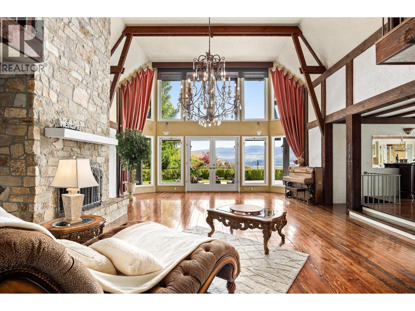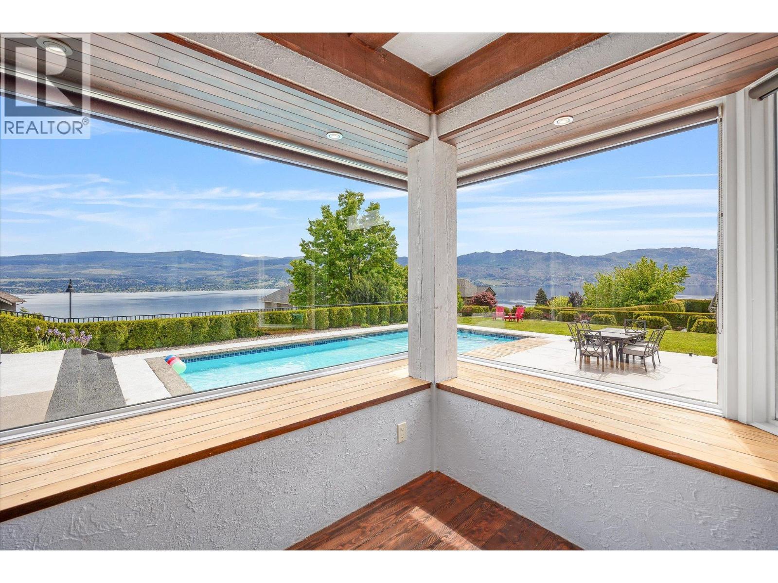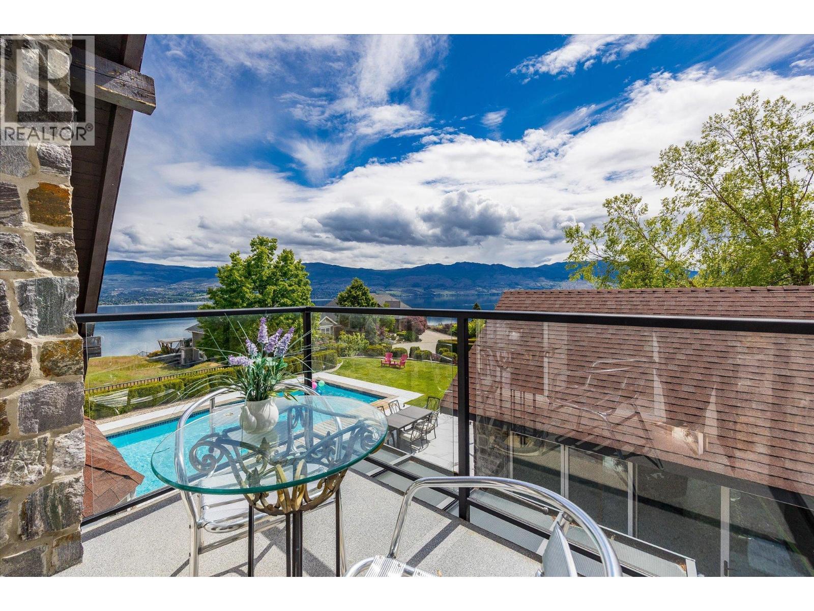 Set on a beautifully landscaped half-acre lot in the exclusive gated community of Thacker Ridge Estates, this remarkable estate home blends luxury, rustic charm, and timeless character. Enjoy breathtaking Okanagan Lake views from your private pool and patio, surrounded by an immaculately maintained yard. Inside, the home is filled with unique touches — rustic wood beams, soaring 20 foot ceilings, and charming secret passages. A grand double-door entrance leads to a sunken living room with a dramatic fireplace and a full wall of windows framing the lush outdoors. The entertainer’s kitchen offers a thoughtful layout with dual sinks, a gas cooktop, double ovens, an oversized fridge-freezer with custom cabinetry, and an adjoining statement dining room perfect for hosting. Upstairs, three spacious bedrooms each feature ensuites, creating private, tranquil retreats. Bonus spaces include a finished attic and a large basement with a recording studio and media room — not included in the main square footage — with 6’2” ceilings, offering extra flexibility and creative potential. An additional highlight is the cabana, complete with a commercial kitchen, bar, and bathroom, ideal for entertaining in resort-style comfort. This home masterfully balances grandeur and warmth, is minutes away from a number of world-class wineries, golf courses, and a short 5 minute drive from all the daily amenities you need, making it a rare and unforgettable opportunity that is perfect for Okanagan living. (id:6769)