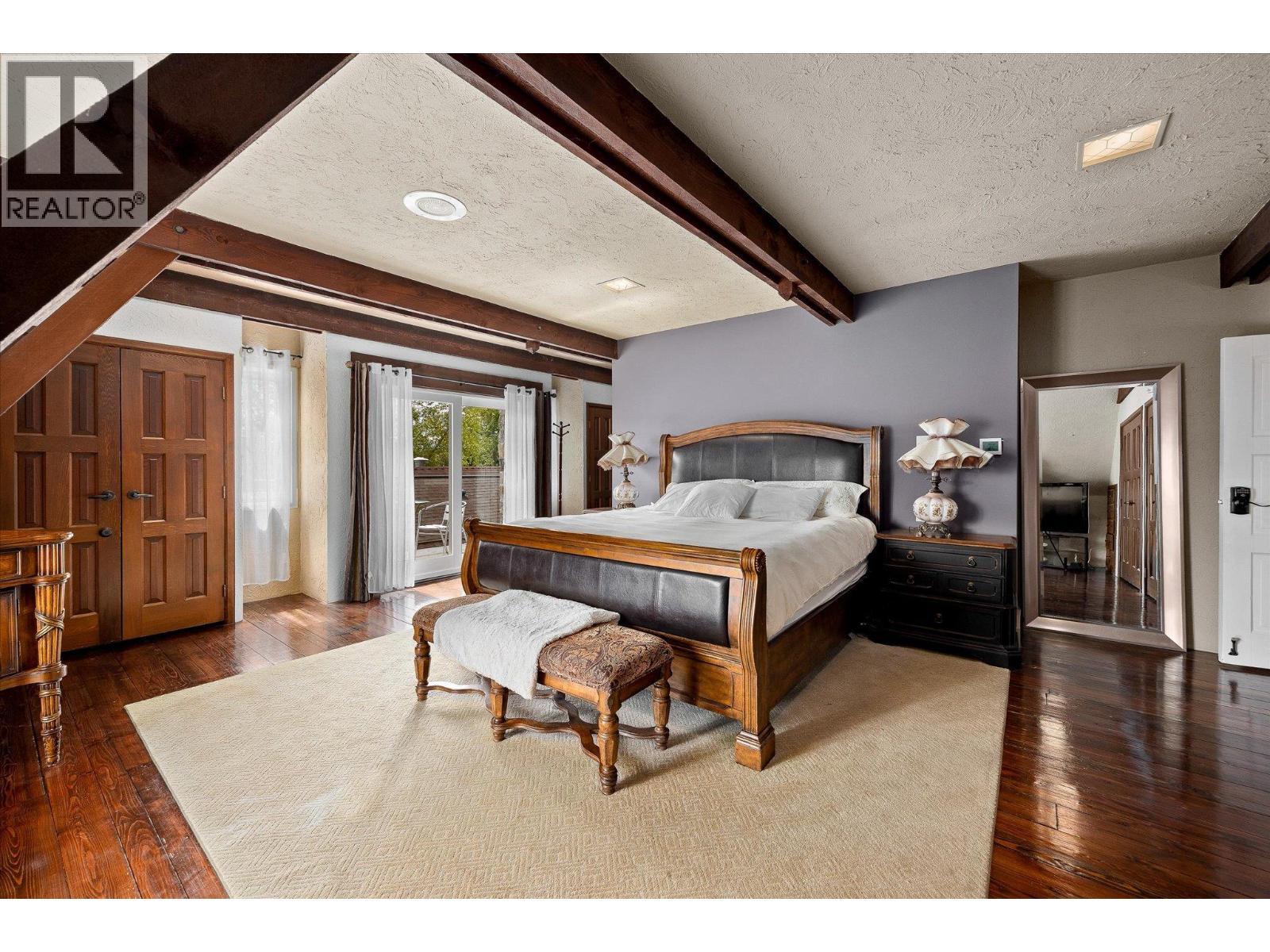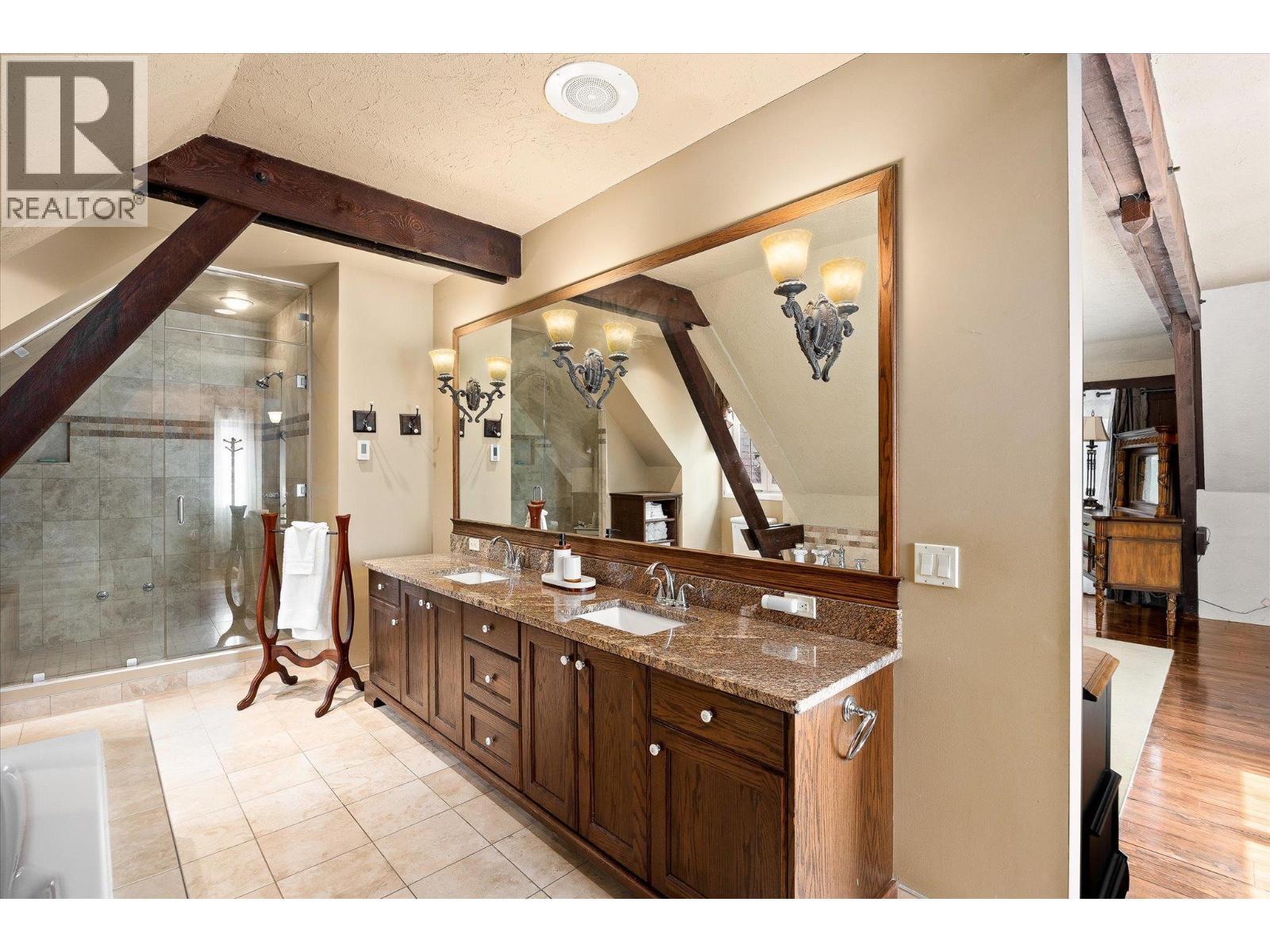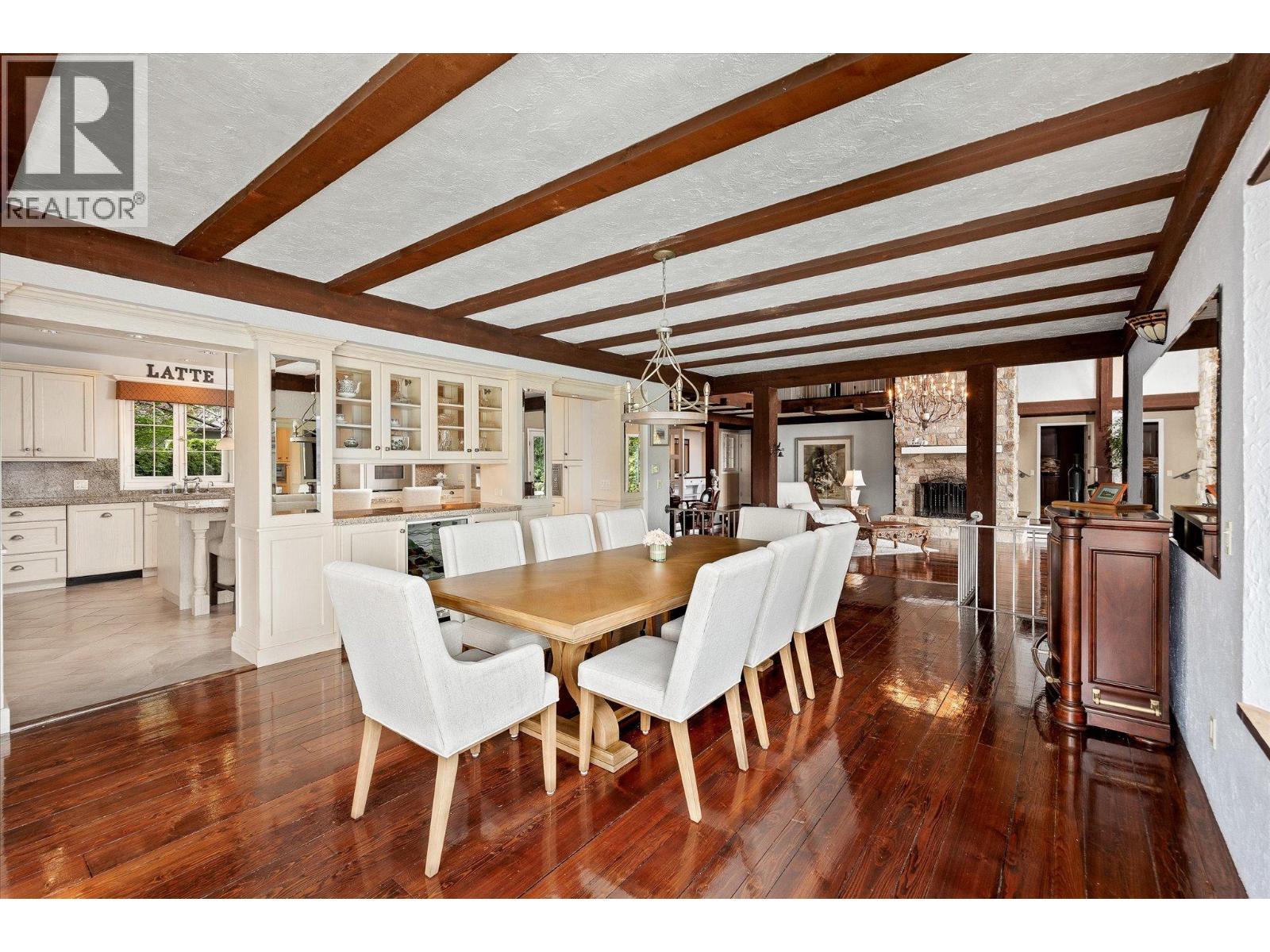 Set on a beautifully landscaped half-acre lot in the exclusive gated community of Thacker Ridge Estates, this remarkable estate home blends luxury, rustic charm, and timeless character. Enjoy breathtaking Okanagan Lake views from your private pool and patio, surrounded by an immaculately maintained yard. Inside, the home is filled with unique touches — rustic wood beams, soaring 20 foot ceilings, and charming secret passages. A grand double-door entrance leads to a sunken living room with a dramatic fireplace and a full wall of windows framing the lush outdoors. The entertainer’s kitchen offers a thoughtful layout with dual sinks, a gas cooktop, double ovens, an oversized fridge-freezer with custom cabinetry, and an adjoining statement dining room perfect for hosting. Upstairs, three spacious bedrooms each feature ensuites, creating private, tranquil retreats. Bonus spaces include a finished attic and a large basement with a recording studio and media room — not included in the main square footage — with 6’2” ceilings, offering extra flexibility and creative potential. An additional highlight is the cabana, complete with a commercial kitchen, bar, and bathroom, ideal for entertaining in resort-style comfort. This home masterfully balances grandeur and warmth, is minutes away from a number of world-class wineries, golf courses, and a short 5 minute drive from all the daily amenities you need, making it a rare and unforgettable opportunity that is perfect for Okanagan living. (id:6769)