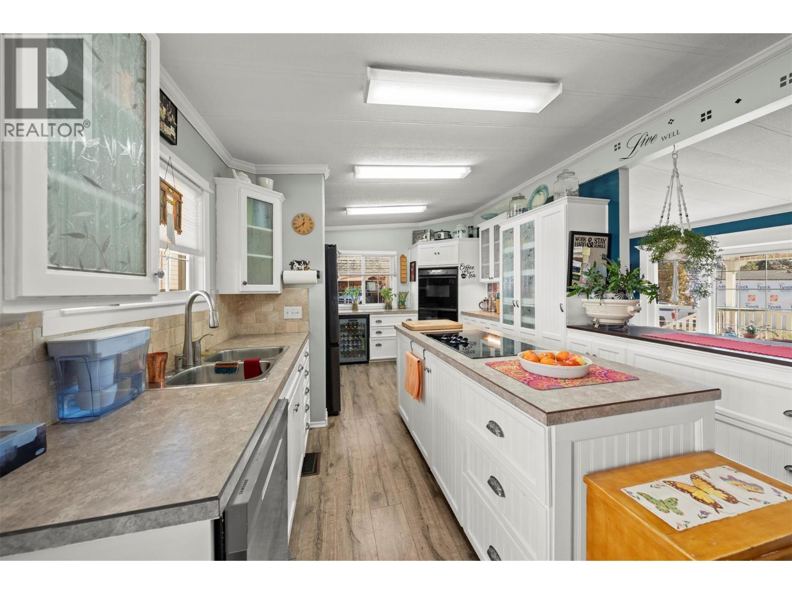 Newly renovated home in a desirable park BEAUTIFUL double wide home boasts 2 bed 2 bath and 1650 sq ft. Step onto your private front veranda thru the french doors and relax with morning coffee and soak up the sun all while enjoying the unparalleled view of Mount Boucherie, and mountains along OK lake. Freshly painted, totally updated with drywall throughout. Living room is large with plenty of light and lovely views from the bay windows and french double door leading to the side deck to the back yard. Appliances are SS and fairly new, fridge (2021), DW (2023), washer/dryer (2020). Both bathrooms have a walk-in glass shower, and the spa like ensuite has a double jetted tub. Master bed has large windows with plenty of light, a large bright office and walk in closer with built in shelves and drawers. The 2nd bedroom is bright and spacious with plenty of light and room for king bed and dressers. A gardeners dream with raised beds along the entire length of the mobile, the front has a beautiful garden bed and side bed alongside a large brick driveway. Newly landscaped private back yard including patio area. Both front and back yards are fenced. Roof is 5 years old, furnace was replaced in 2020 with a high efficiency and windows are new. House is located on a very quiet road in a well managed park. It is in the adult section (19+). Close to shopping, wineries, beaches, and hiking trails. 2 Pets welcome without size limits, with park approval. (id:6769)