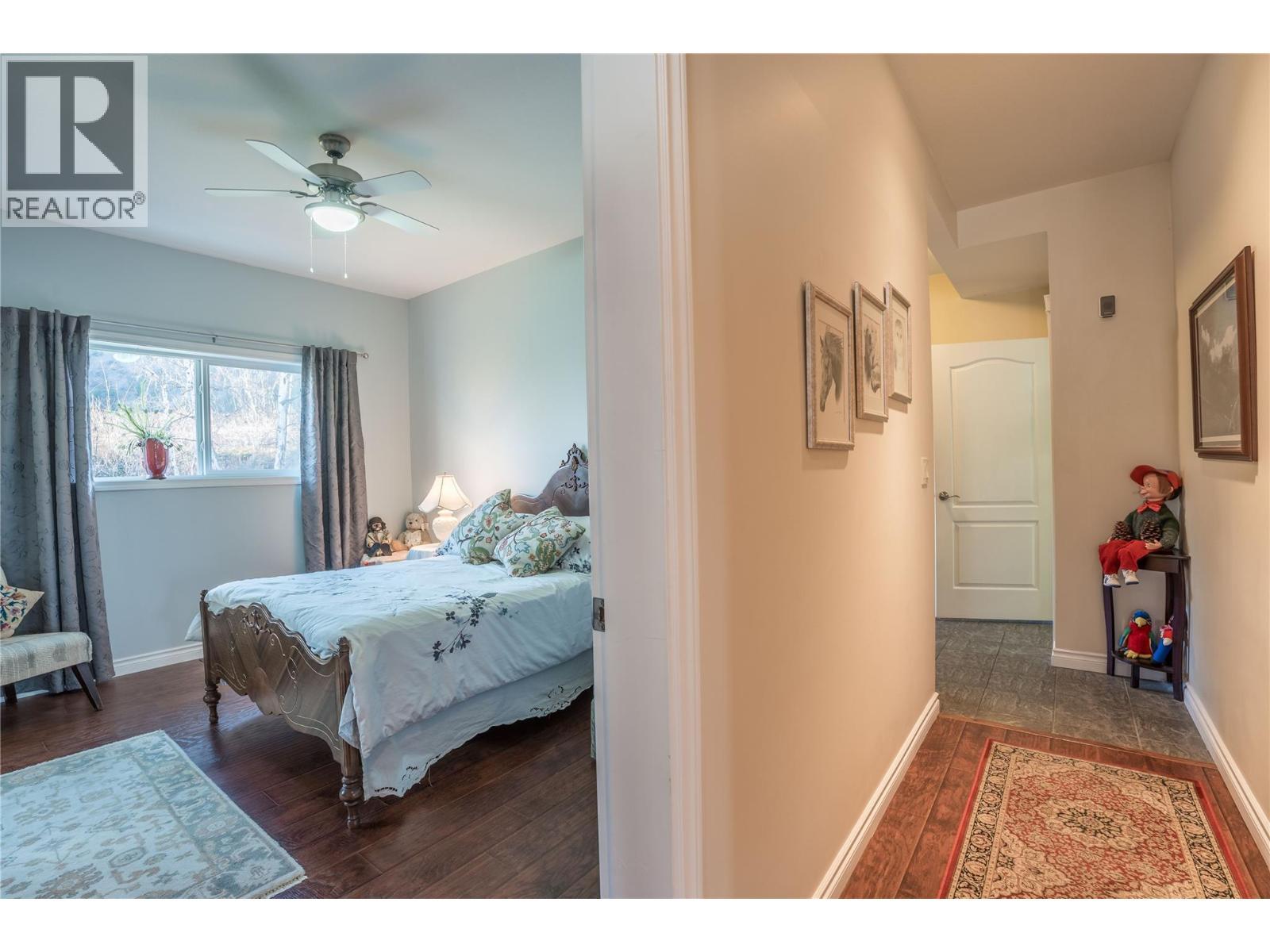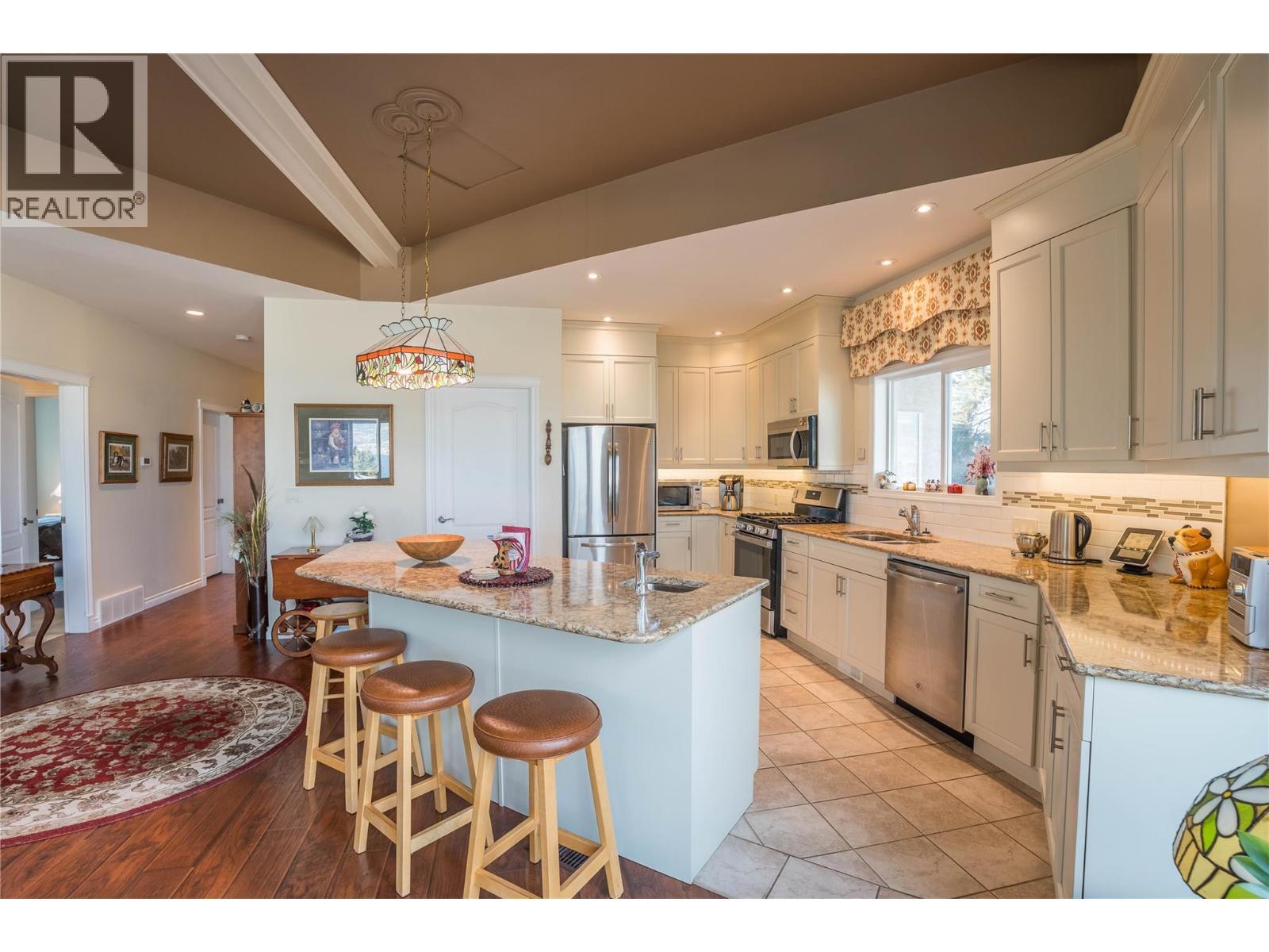 Welcome to 7118 Hespeler Road-a truly unique, castle-inspired custom lakeview home offering a thoughtful floorplan with a functional design. This 4-bdrm level-entry home is designed with an open-concept, vaulted ceilings, and a warm, inviting atmosphere. The main living area features a stunning kitchen with gas range, stainless appliances, walk in pantry, a large island, perfect for entertaining. Step out to the wrap-around deck where you can take in the lake and mountain views. Also, on the main floor you’ll find a guest bedroom, bathroom, office nook, and a spacious primary bedroom complete with a walk-in closet and the rare luxury of dual “his and hers” ensuite bathrooms. Main level laundry in the mudroom area off the carport. The walk-out daylight basement with a separate entrance provides flexibility with a spacious main bedroom plus a “secret room” as the 4th bedroom. Large family room area with a kitchenette plus a 3-piece bathroom, perfect for guests, extended family, and a natural for a suite. Car enthusiasts will love the impressive two-bay garage with a car hoist & mezzanine, loaded with all the goods, plumbing, dedicated plugs for a compressor, welding, and a heater. The deep driveway also includes a large RV pad with full hook ups as well as additional covered parking. This low-maintenance property is complete with artificial turf, xeriscaping, and underground irrigation, providing sensibility for easy living, perfectly fitting the Okanagan lifestyle. (id:6769)
