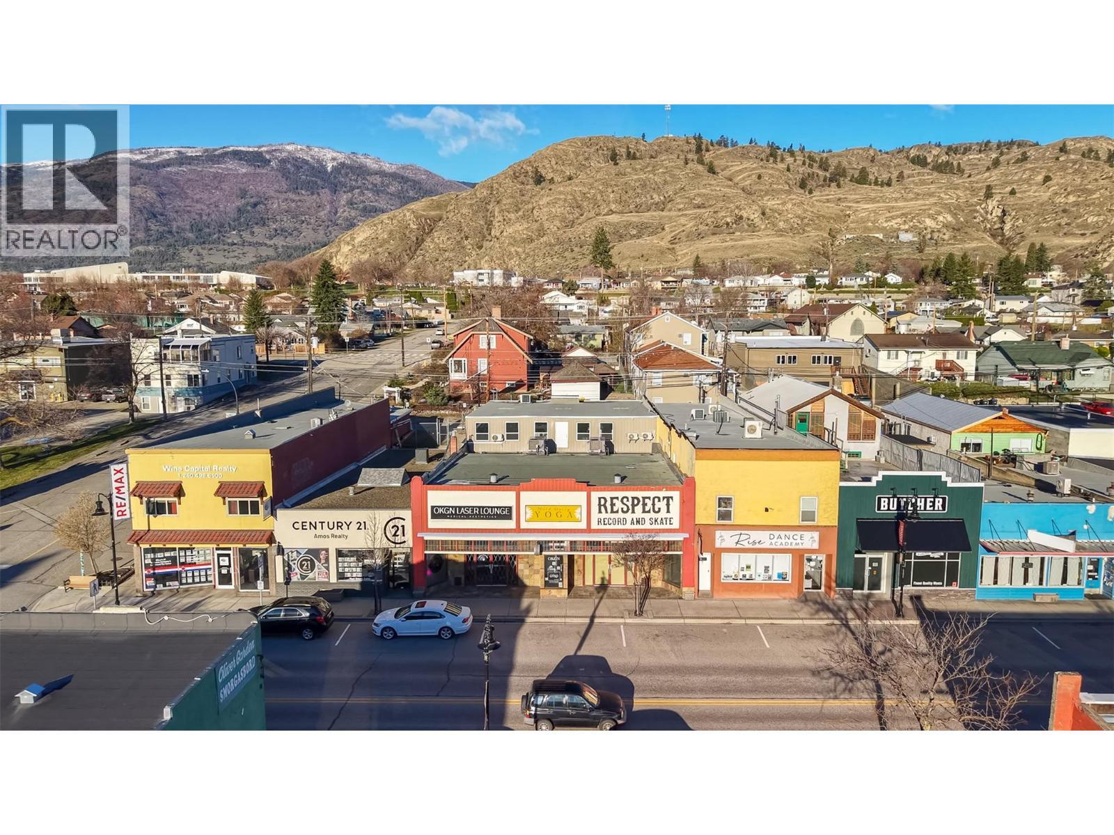 Hallmark building in prime downtown core of Canada's Wine Capital! 7,300 feet of space: 10 tenanted spaces varying from 150 to nearly 1700 sq. ft. Market appropriate rents = zero vacancy & minimal turn. Cap rate just under 6%. Tenants include RETAIL: Respect Record and Skate, Pottery Studio, CONVENIENCE RETAIL: CRISP Hair Salon, OKGN Laser Lounge, Olan Beauty, WELLNESS: Pilates Plus Fitness & Rehabilitation, Wild Daisy Yoga, Desert Rose Massage Therapy, SERVICE: Bookkeeping and Sewing Machine Repair. Additional hallway/gallery space provided as community service to Sagebrushers Art Collective. Approximate 70/30 split between larger, street-level ground floor, and second floor with direct, level access to rear alley. Main level features two large retail storefronts, a glass vestibule to the gallery space providing direct access to remaining first floor businesses, and public stairwell to second floor at rear of building. Two second floor spaces are flooded with light from oversized, east facing windows, and all benefit from stairwell and rear alley accessibility. 2 general access washrooms (1 each level), plus 3rd dedicated to the Pilates space. Period features include original, wide plank floors, post and beam construction, high ceilings, exposed ductwork, and vintage freight elevator shaft head. Current owner upgrades: HVAC & AC, electrical, plumbing, roofing. Measurements approximate. Buyer to verify if important. Cost effective third party management available if desired. (id:6769)